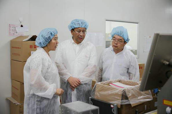 在际华华津制药公司,戴和根一行首先来到华津制药老厂区,参观3526创意工场的同时,听取了公司执行董事陈桂娥对园区基本情况的介绍,并对园区租户的相关情况进行了了解。当天下午,又来到华津制药位于滨海新区的生产研发基地,对生产车间、仓库、化验室等生产现场进行了参观调研,每到一处,戴和根都详细询问生产过程、产品产量、产品定位和市场销量等等,对公司的主要产品给与了高度的关注,同时对药品的检验过程进行了详尽的了解。戴和根还听取了公司执行董事陈桂娥对企业基本情况、生产经营情况及党建工作情况的详细汇报。