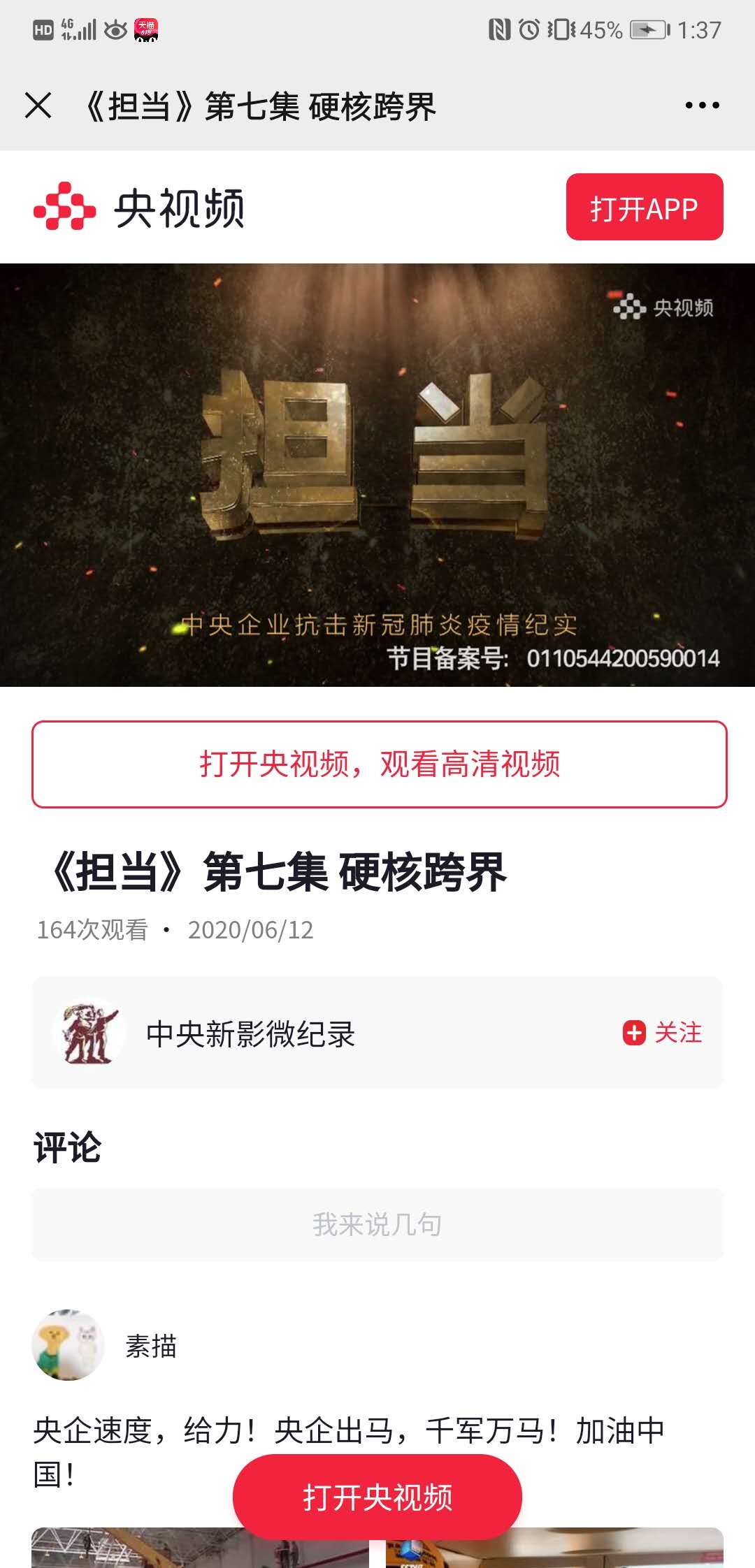 由国务院国资委宣传工作局,近百家中央企业,中央新影集团,爱奇艺社会责任联合推出的新媒体纪录片《担当-中央企业抗击新冠肺炎疫情纪实》在央视频、爱奇艺平台发布。该片既有执着坚守、感人事迹,又有央企责任、家国情怀,彰显了在关键时刻中央企业大国顶梁柱,党和国家最可信赖依靠力量的使命、担当和作为。