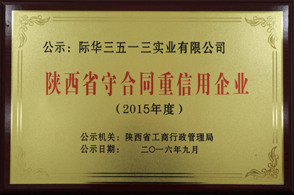 近日,陕西省工商行政管理局发布《关于公示2015年度守合同重信用企业的通知》,际华3513公司再次荣获陕西省“守合同重信用”企业荣誉称号。