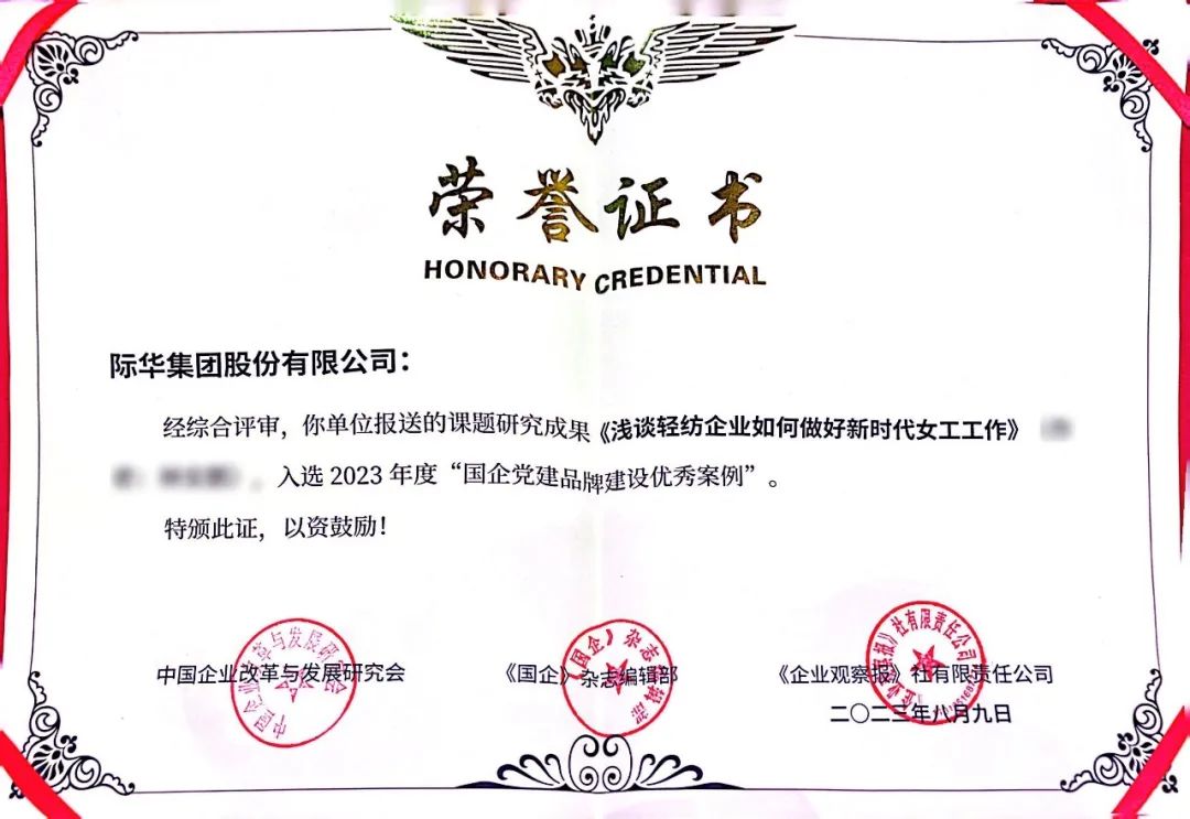 10月20日,第二届国有企业党的建设论坛在济南举办,际华股份课题研究成果《浅谈轻纺企业如何做好新时代女工工作》成功入选2023年度“国企党建品牌建设优秀案例”名单。此评选由中国企业改革与发展研究会担任指导单位、中国企业管理研究会企业党建研究院担任支持单位、《国企》杂志主办。